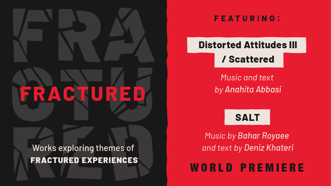 Guerilla Opera joins the Museum for a one-night-only live event, FRACTURED, a performance exhibition of two new works by composers Anahita Abassi and Bahar Royaee exploring themes of fractured experiences, directed by Deniz Khateri.